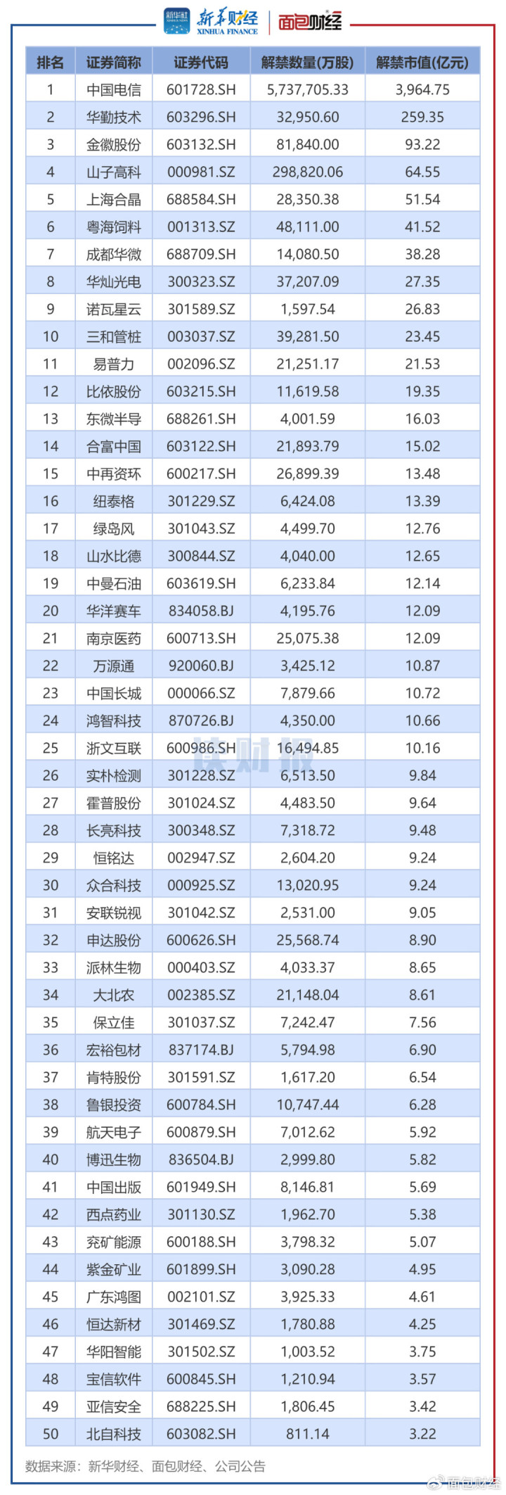 具体来看,中国电信、华勤技术、金徽股份解禁规模位列前三。
