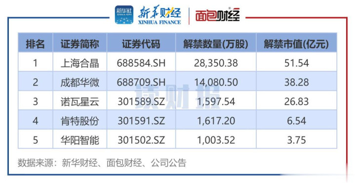 此外,共有5家公司合计4.66亿限售股于2月迎上市周年解禁,解禁市值为126.94亿元,包括上海合晶、成都华微、诺瓦星云等企业。